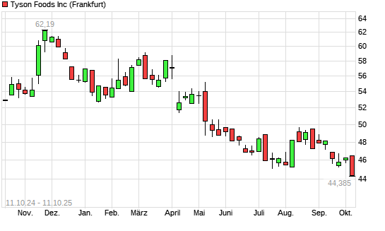 Mit dem Rücksetzer auf 44,38 EUR hat die Tyson Foods-Aktie (ISIN US9024941034) am 10.10.2025 ein neues 12-Monats-Tief erreicht und damit den Kurs vom 09.10.2025 eingestellt.