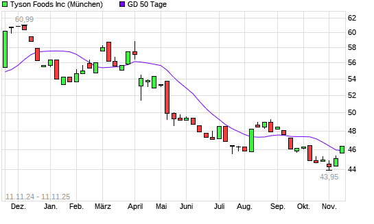 Mit dem Anstieg auf 46,21 EUR hat die Tyson Foods-Aktie am 10.11.2025 die 50-Tage-Linie nach oben gekreuzt.