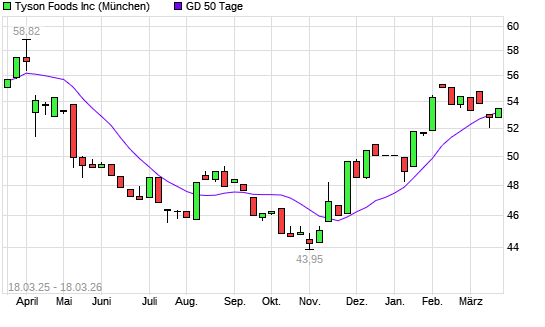 Mit dem Anstieg auf 53,36 EUR hat die Tyson Foods-Aktie am 17.03.2026 die 50-Tage-Linie nach oben gekreuzt.