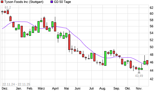 Mit dem Rücksetzer auf 45,37 EUR hat die Tyson Foods-Aktie am 21.11.2025 die 50-Tage-Linie nach unten gekreuzt.