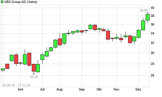 Mit dem Anstieg auf 37,75 EUR hat die UBS Group-Aktie (ISIN CH0244767585) am 16.12.2025 ein neues 10-Jahres-Hoch erreicht und damit den Kurs vom 12.12.2025 eingestellt.