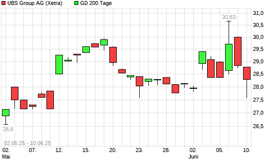 Mit dem Rücksetzer auf 29,02 EUR hat die UBS Group-Aktie am 09.06.2025 die 200-Tage-Linie nach unten gekreuzt.