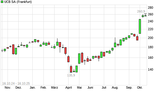 Mit dem Anstieg auf 260,90 EUR hat die UCB-Aktie (ISIN BE0003739530) am 15.10.2025 ein neues All-Time-High erreicht und damit den Kurs vom 09.10.2025 eingestellt.