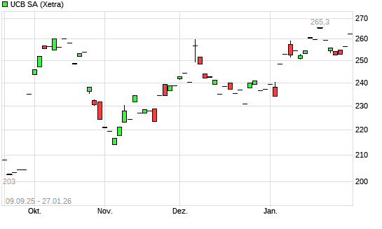 Mit dem Anstieg auf 263,00 EUR hat die UCB-Aktie (ISIN BE0003739530) am 28.01.2026 ein neues All-Time-High erreicht und damit den Kurs vom 15.10.2025 eingestellt.