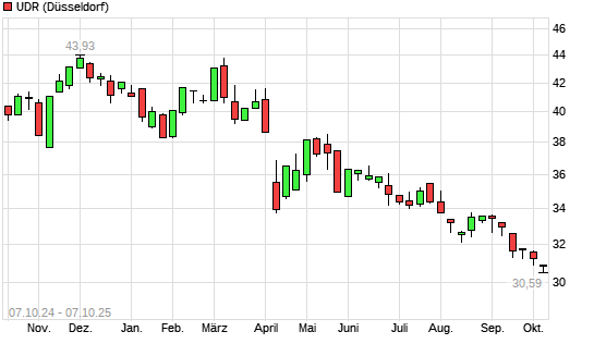 Mit dem Rücksetzer auf 30,66 EUR hat die UDR-Aktie (ISIN US9026531049) am 06.10.2025 ein neues 12-Monats-Tief erreicht und damit den Kurs vom 02.10.2025 eingestellt.