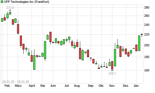 Mit dem Anstieg auf 222,80 EUR hat die UFP Technologies-Aktie (ISIN US9026731029) am 15.01.2026 ein neues 6-Monats-Hoch erreicht und damit den Kurs vom 13.01.2026 eingestellt.