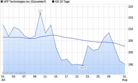 Mit dem Rücksetzer auf 201,80 EUR hat die UFP Technologies-Aktie am 31.07.2025 die 20-Tage-Linie nach unten gekreuzt.
