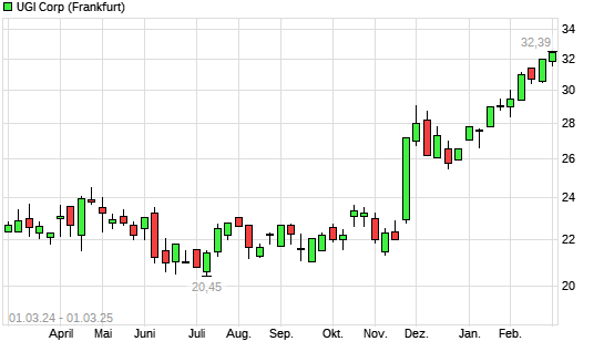 Die UGI-Aktie befindet sich seit dem 18.11.2024 im langfristigen Aufwärtstrend und hat in diesem Zeitraum +45,02% an Wert gewonnen. Der Abstand zur 200-Tage-Linie beträgt aktuell +32,66%.
