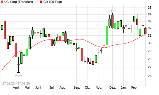 Die UGI-Aktie befindet sich seit dem 19.11.2025 im langfristigen Aufwärtstrend und hat in diesem Zeitraum +4,25% an Wert gewonnen. Der Abstand zur 200-Tage-Linie beträgt aktuell +1,41%.