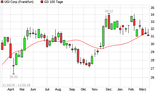 Die UGI-Aktie befindet sich seit dem 19.11.2025 im langfristigen Aufwärtstrend und hat in diesem Zeitraum +4,86% an Wert gewonnen. Der Abstand zur 200-Tage-Linie beträgt aktuell +2,00%.