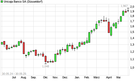 Mit dem Anstieg auf 1,92 EUR hat die UNICAJA BANCO SA-Aktie (ISIN ES0180907000) am 29.05.2025 ein neues All-Time-High erreicht und damit den Kurs vom 27.05.2025 eingestellt.