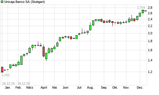 Mit dem Anstieg auf 2,73 EUR hat die UNICAJA BANCO SA-Aktie (ISIN ES0180907000) am 15.12.2025 ein neues All-Time-High erreicht und damit den Kurs vom 11.12.2025 eingestellt.