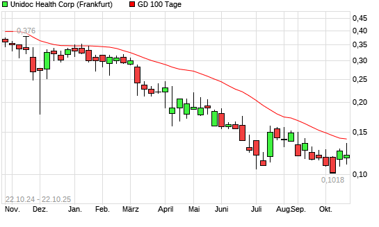 Mit dem Rücksetzer auf 0,12 EUR hat die UNIDOC HEALTH CORP-Aktie am 21.10.2025 die 100-Tage-Linie nach unten gekreuzt.
