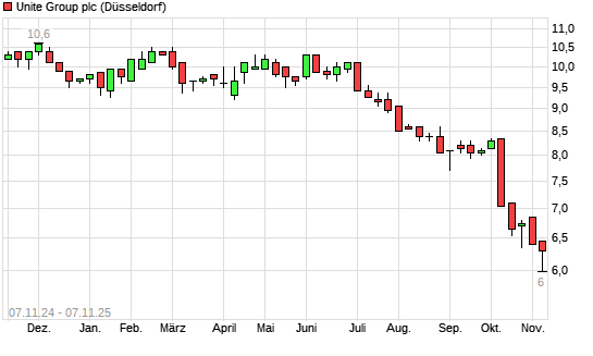Mit dem Rücksetzer auf 6,25 EUR hat die UNITE GROUP-Aktie (ISIN GB0006928617) am 06.11.2025 ein neues 5-Jahres-Tief erreicht und damit den Kurs vom 03.11.2025 eingestellt.