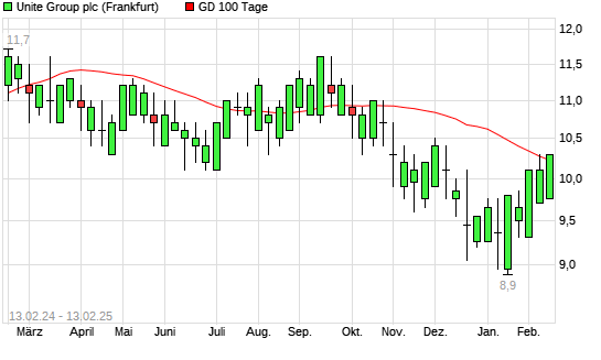 Mit dem Anstieg auf 10,20 hat die UNITE GROUP-Aktie am 12.02.2025 die 100-Tage-Linie nach oben gekreuzt.