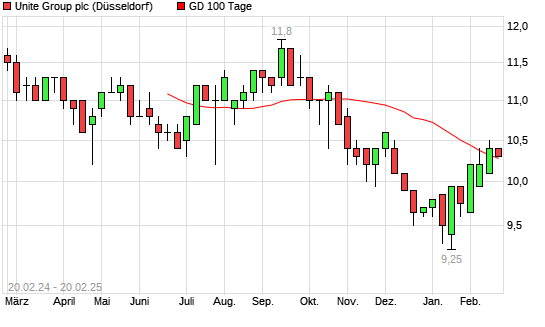 Mit dem Rücksetzer auf 10,10 hat die UNITE GROUP-Aktie am 19.02.2025 die 100-Tage-Linie nach unten gekreuzt.