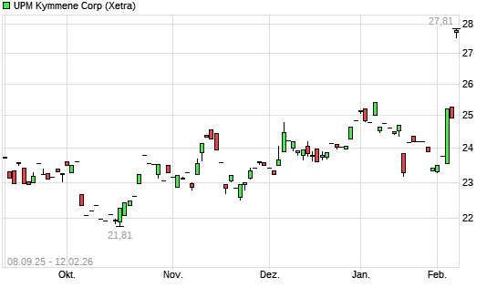 Mit dem Anstieg auf 27,63 EUR hat die UPM Kymmene-Aktie (ISIN FI0009005987) am 11.02.2026 ein neues 6-Monats-Hoch erreicht und damit den Kurs vom 10.02.2026 eingestellt.
