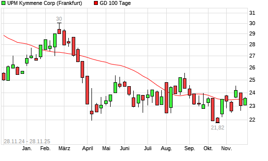 Mit dem Anstieg auf 23,58 EUR hat die UPM Kymmene-Aktie am 27.11.2025 die 100-Tage-Linie nach oben gekreuzt.