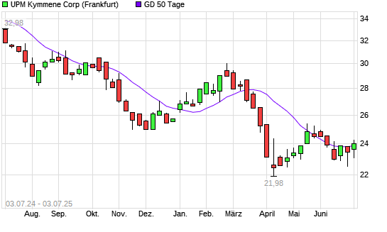 Mit dem Anstieg auf 24,00 EUR hat die UPM Kymmene-Aktie am 02.07.2025 die 50-Tage-Linie nach oben gekreuzt.