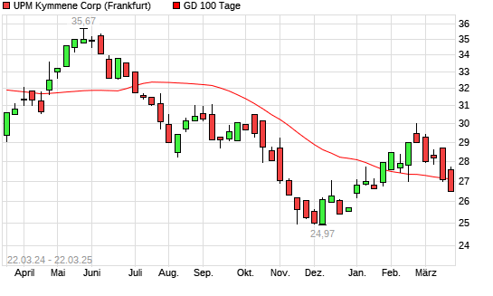 Mit dem Rücksetzer auf 26,50 EUR hat die UPM Kymmene-Aktie am 21.03.2025 die 100-Tage-Linie nach unten gekreuzt.