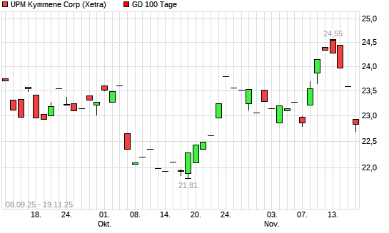 Mit dem Rücksetzer auf 23,36 EUR hat die UPM Kymmene-Aktie am 18.11.2025 die 100-Tage-Linie nach unten gekreuzt.