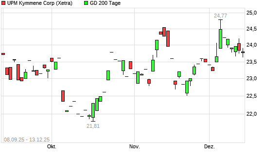 Mit dem Rücksetzer auf 23,77 EUR hat die UPM Kymmene-Aktie am 12.12.2025 die 200-Tage-Linie nach unten gekreuzt.