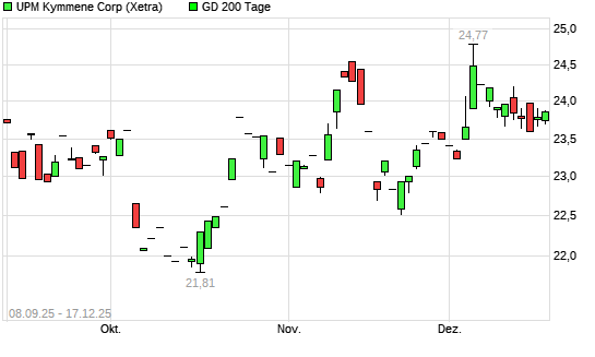 Mit dem Rücksetzer auf 23,72 EUR hat die UPM Kymmene-Aktie am 16.12.2025 die 200-Tage-Linie nach unten gekreuzt.