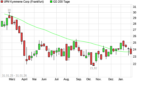 Mit dem Rücksetzer auf 23,42 EUR hat die UPM Kymmene-Aktie am 30.01.2026 die 200-Tage-Linie nach unten gekreuzt.