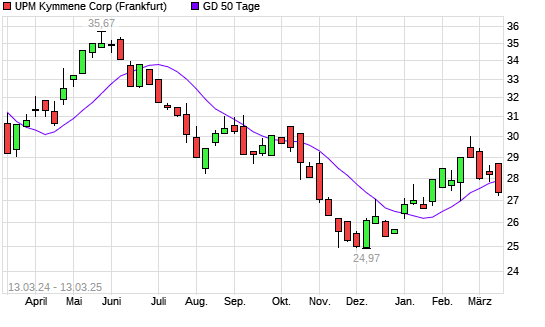 Mit dem Rücksetzer auf 27,42 EUR hat die UPM Kymmene-Aktie am 12.03.2025 die 50-Tage-Linie nach unten gekreuzt.