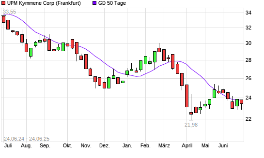Mit dem Rücksetzer auf 22,90 EUR hat die UPM Kymmene-Aktie am 23.06.2025 die 50-Tage-Linie nach unten gekreuzt.