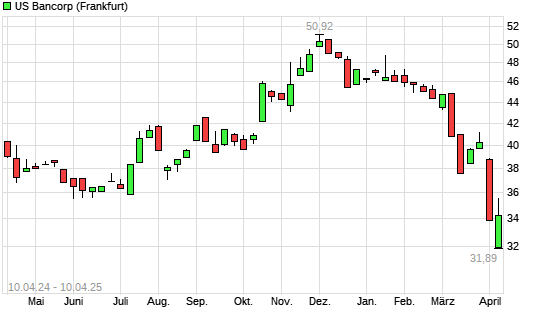 Mit dem Rücksetzer auf 32,10 EUR hat die US Bancorp-Aktie (ISIN US9029733048) am 09.04.2025 ein neues 12-Monats-Tief erreicht und damit den Kurs vom 07.04.2025 eingestellt.