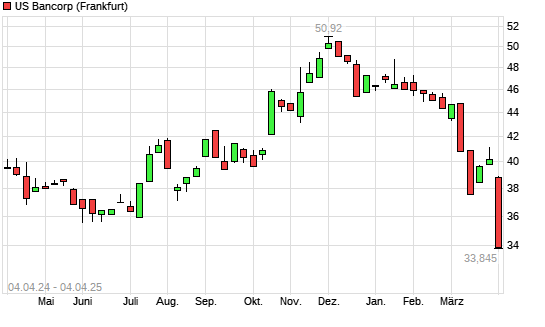Mit dem Rücksetzer auf 36,95 EUR hat die US Bancorp-Aktie (ISIN US9029733048) am 03.04.2025 ein neues 6-Monats-Tief erreicht und damit den Kurs vom 14.03.2025 eingestellt.