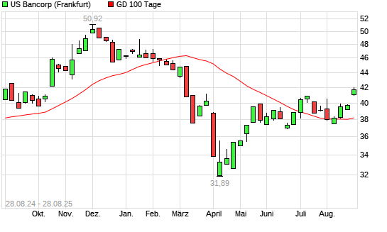 Mit dem Rücksetzer auf 33,71 EUR hat die US Bancorp-Aktie am 27.08.2025 die 100-Tage-Linie nach unten gekreuzt.