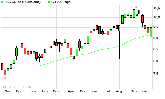 Mit dem Rücksetzer auf 9,20 EUR hat die USS CO TOKAI-Aktie am 13.10.2025 die 200-Tage-Linie nach unten gekreuzt.