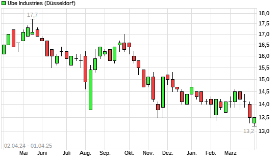 Mit dem Rücksetzer auf 13,40 EUR hat die Ube Industries-Aktie (ISIN JP3158800007) am 31.03.2025 ein neues 6-Monats-Tief erreicht und damit den Kurs vom 28.03.2025 eingestellt.