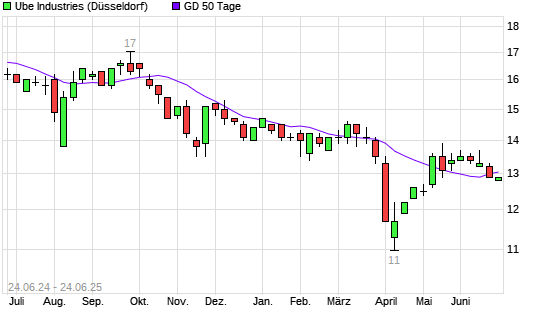 Mit dem Rücksetzer auf 12,90 EUR hat die Ube Industries-Aktie am 23.06.2025 die 50-Tage-Linie nach unten gekreuzt.