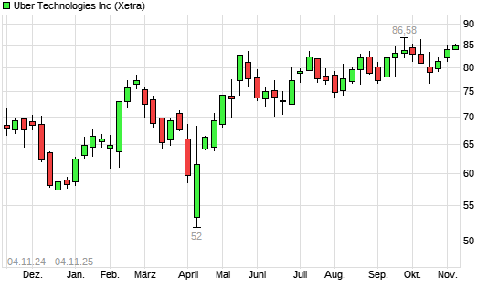 Mit dem Anstieg auf 86,70 EUR hat die Uber-Aktie (ISIN US90353T1007) am 03.11.2025 ein neues All-Time-High erreicht und damit den Kurs vom 06.10.2025 eingestellt.