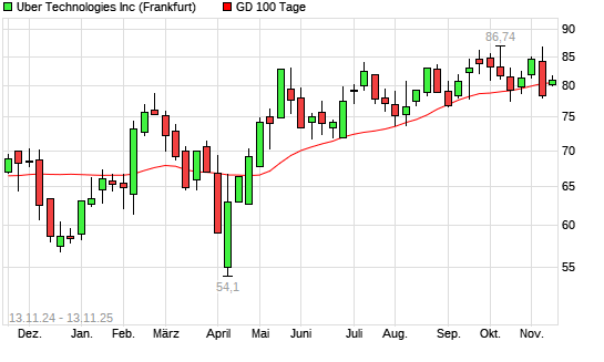 Mit dem Anstieg auf 80,90 EUR hat die Uber-Aktie am 12.11.2025 die 100-Tage-Linie nach oben gekreuzt.