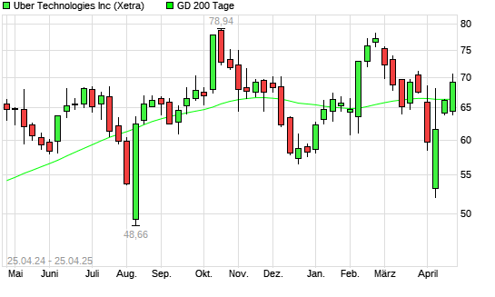Mit dem Anstieg auf 68,18 EUR hat die Uber-Aktie am 24.04.2025 die 200-Tage-Linie nach oben gekreuzt.