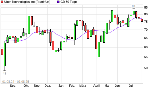 Mit dem Anstieg auf 77,79 EUR hat die Uber-Aktie am 31.07.2025 die 50-Tage-Linie nach oben gekreuzt.