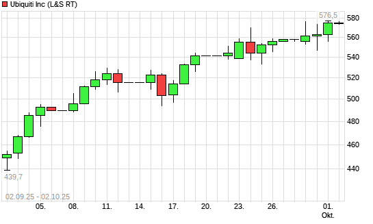 Mit dem Anstieg auf 575,00 EUR hat die Ubiquiti-Aktie (ISIN US90353W1036) am 01.10.2025 ein neues All-Time-High erreicht und damit den Kurs vom 29.09.2025 eingestellt.