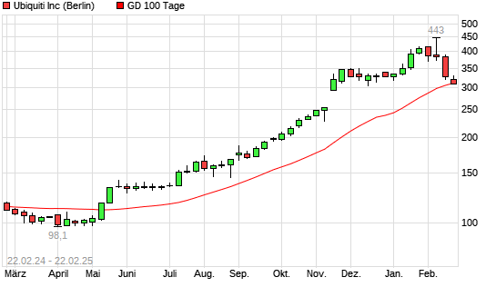 Mit dem Rücksetzer auf 308,00 EUR hat die Ubiquiti-Aktie am 21.02.2025 die 100-Tage-Linie nach unten gekreuzt.