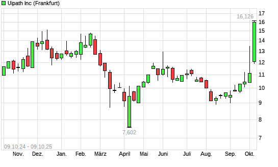 Mit dem Anstieg auf 13,34 EUR hat die UiPath-Aktie (ISIN US90364P1057) am 08.10.2025 ein neues 6-Monats-Hoch erreicht und damit den Kurs vom 07.10.2025 eingestellt.