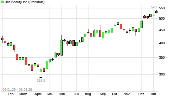 Mit dem Anstieg auf 537,60 EUR hat die Ulta Beauty-Aktie (ISIN US90384S3031) am 05.01.2026 ein neues All-Time-High erreicht und damit den Kurs vom 14.03.2024 eingestellt.