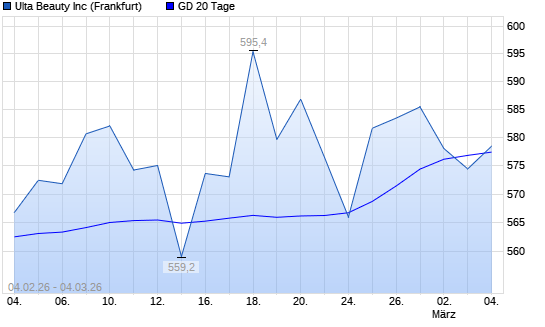 Mit dem Rücksetzer auf 574,40 EUR hat die Ulta Beauty-Aktie am 03.03.2026 die 20-Tage-Linie nach unten gekreuzt.