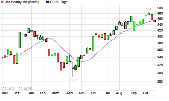 Mit dem Rücksetzer auf 449,90 EUR hat die Ulta Beauty-Aktie am 21.10.2025 die 50-Tage-Linie nach unten gekreuzt.