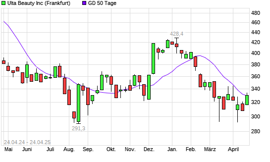 Mit dem Anstieg auf 334,10 EUR hat die Ulta Beauty-Aktie am 23.04.2025 die 50-Tage-Linie nach oben gekreuzt.Die Ulta Beauty-Aktie befindet sich seit dem 12.02.2025 im langfristigen Abwärtstrend ...weiterlesen