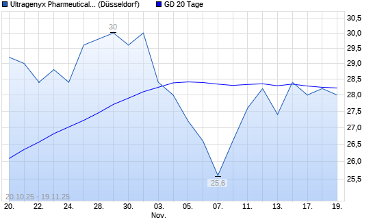 Mit dem Rücksetzer auf 27,80 EUR hat die Ultragenyx Pharmeutical-Aktie am 18.11.2025 die 20-Tage-Linie nach unten gekreuzt.