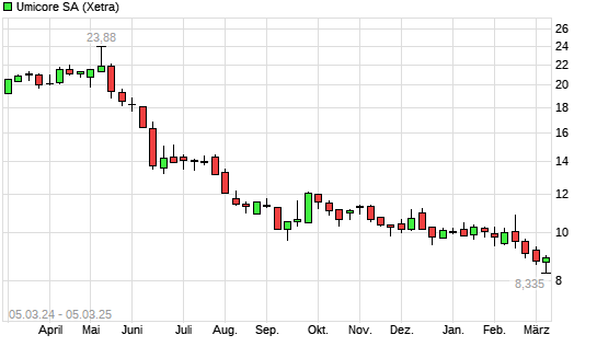 Mit dem Rücksetzer auf 8,57 EUR hat die Umicore-Aktie (ISIN BE0974320526) am 04.03.2025 ein neues 10-Jahres-Tief erreicht und damit den Kurs vom 28.02.2025 eingestellt.