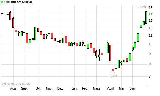 Mit dem Anstieg auf 14,44 EUR hat die Umicore-Aktie (ISIN BE0974320526) am 02.07.2025 ein neues 6-Monats-Hoch erreicht und damit den Kurs vom 01.07.2025 eingestellt.
